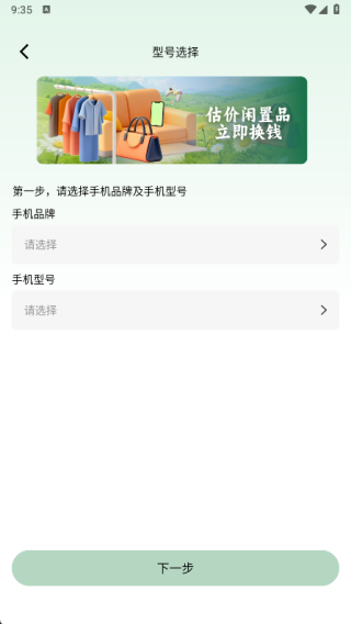 2、在闲置商品估价界面,进行型号选择,完成输入后,进入到下一步。