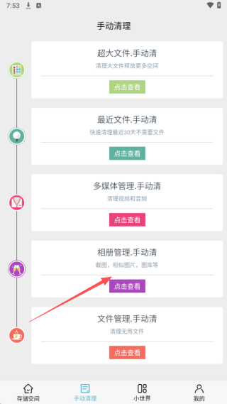 1、下载并安装好软件,点击进入底部的手动清理板块,然后点击相册管理。