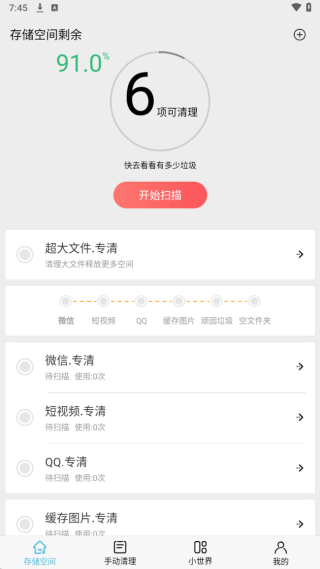 2、进入软件首页,有超大文件专清、微信专清、短视频专清等实用功能,用户可以选择使用。