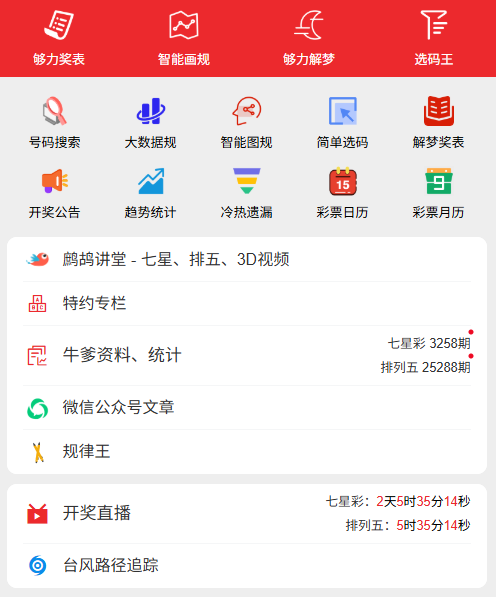 -功能区集成多种彩票类型选择,包含奖表、走势、号码推荐等核心内容,结合智能数据处理机制,让所有内容呈现更精准,体验高效便捷的服务操作模式。