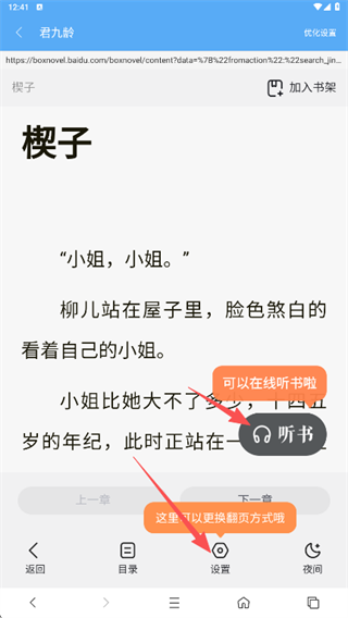 4、点击页面中间区域,出现阅读菜单栏,这里还可以选择听书或者设置翻页模式等。