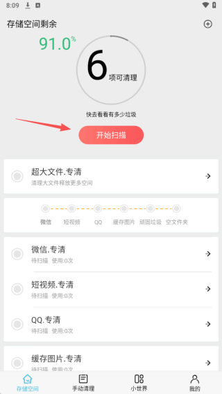 1、下载并安装好小二清理最新版软件,点击进入软件首页,然后点击开始扫描。
