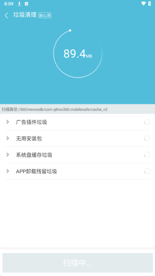 2、然后软件会对手机广告插件垃圾、无用安装包、系统盘缓存等进行扫描。